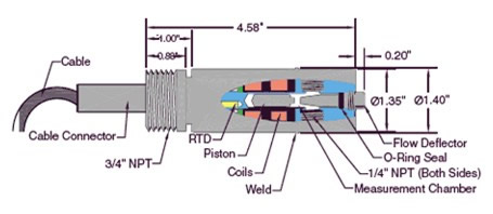 位于活塞上方的導(dǎo)流裝置,將液體導(dǎo)入測量室,活塞持續(xù)運(yùn)動以不斷更新樣品,同時機(jī)械摩擦不斷擦洗測量室。 一個內(nèi)置的RTD溫度測量探頭,實(shí)時測量測量室的溫度。